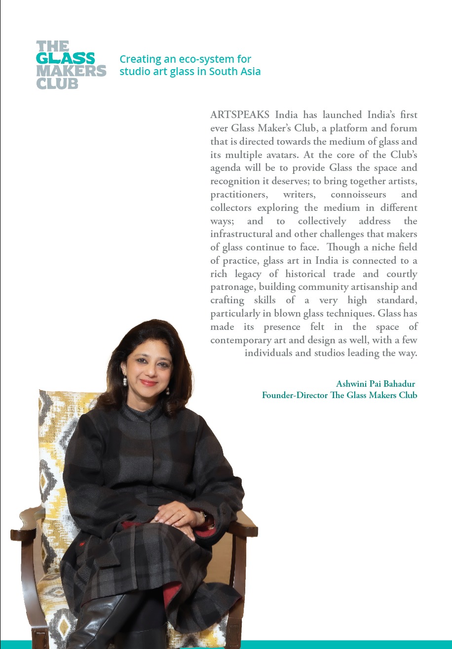 Studio Glass is today a niche field of practice in India though glass art in India is connected to a long legacy of historical trade and courtly patronage, building community artisanship and craft of a very high level, particularly in blown glass techniques. Glass has made its presence felt in the space of contemporary art and design as well, with a few individuals and studios leading the way. Ashwini’s initiative and enterprise in establishing The Glass Makers Club showcases her dedication to promoting glass art in South Asia, filling a crucial gap in the artistic community and providing a platform for artists to advocate for their medium.